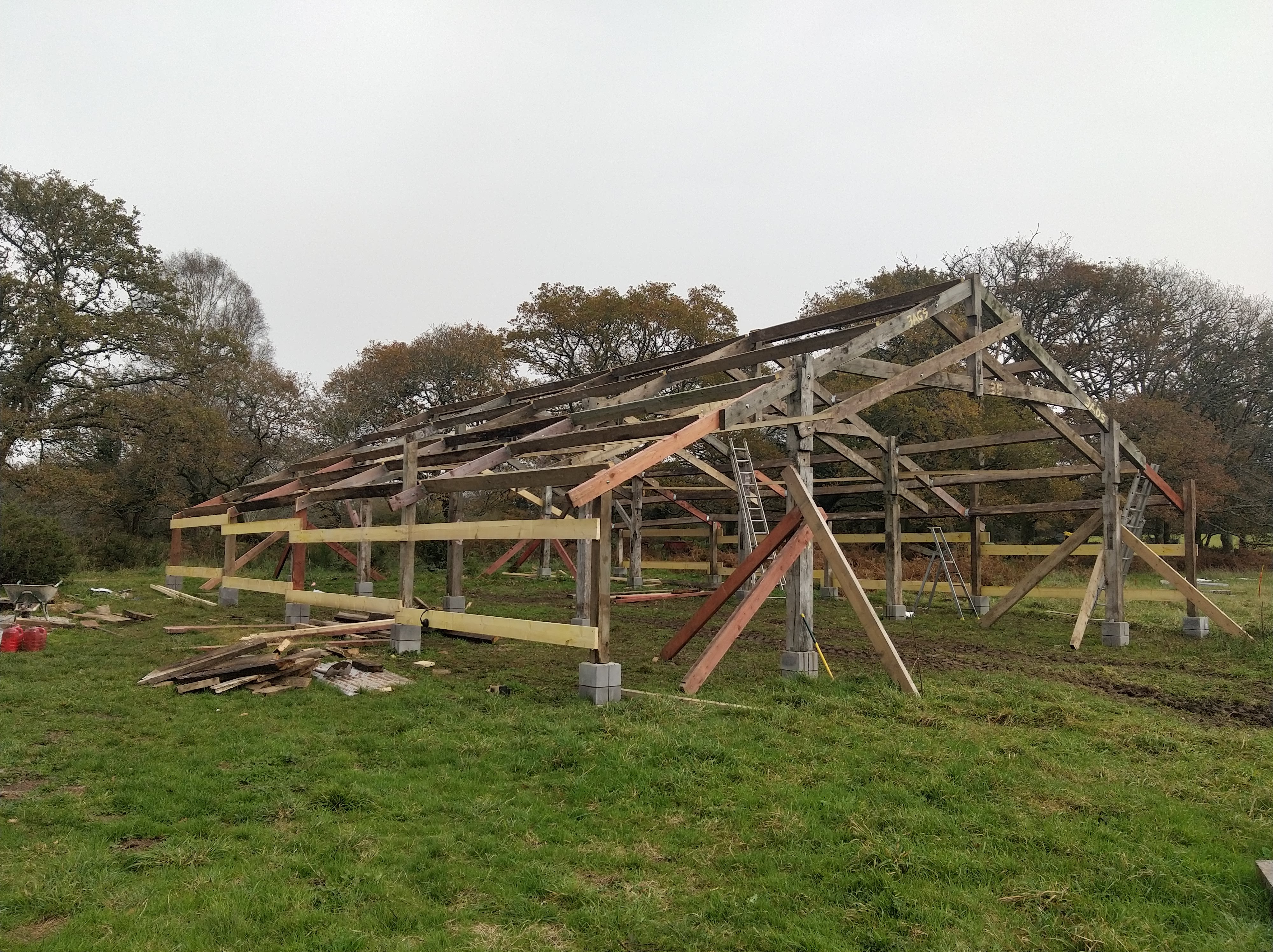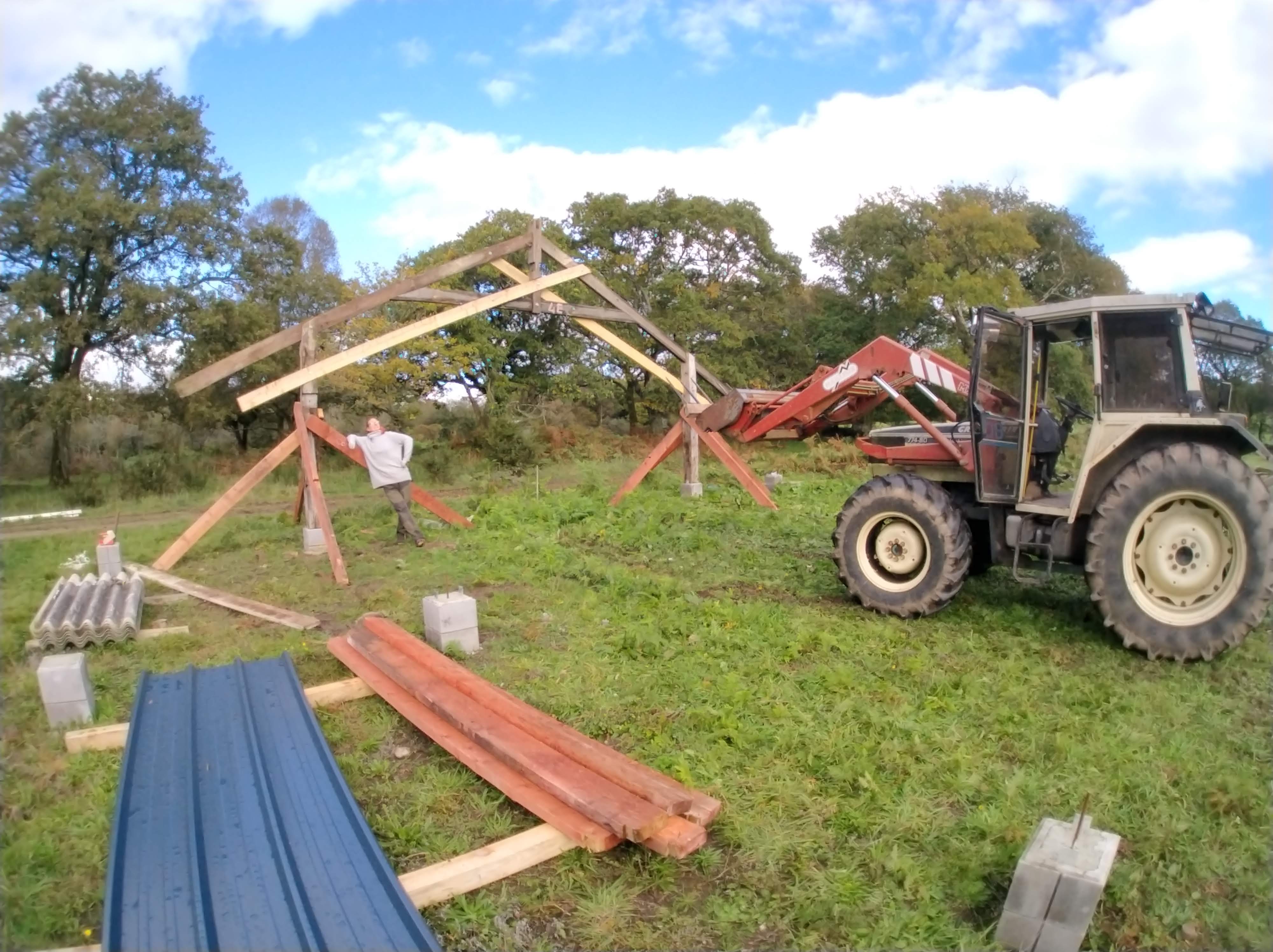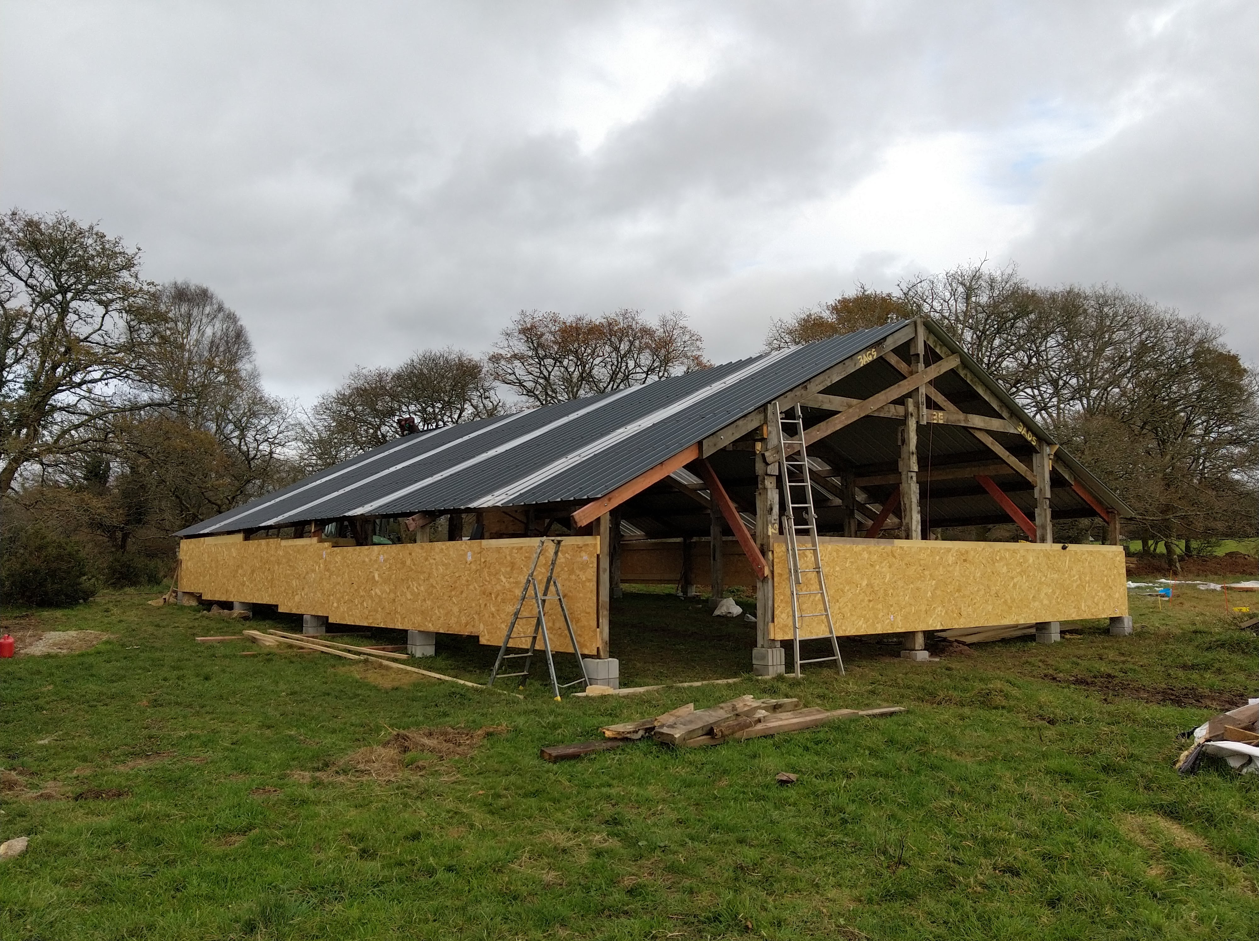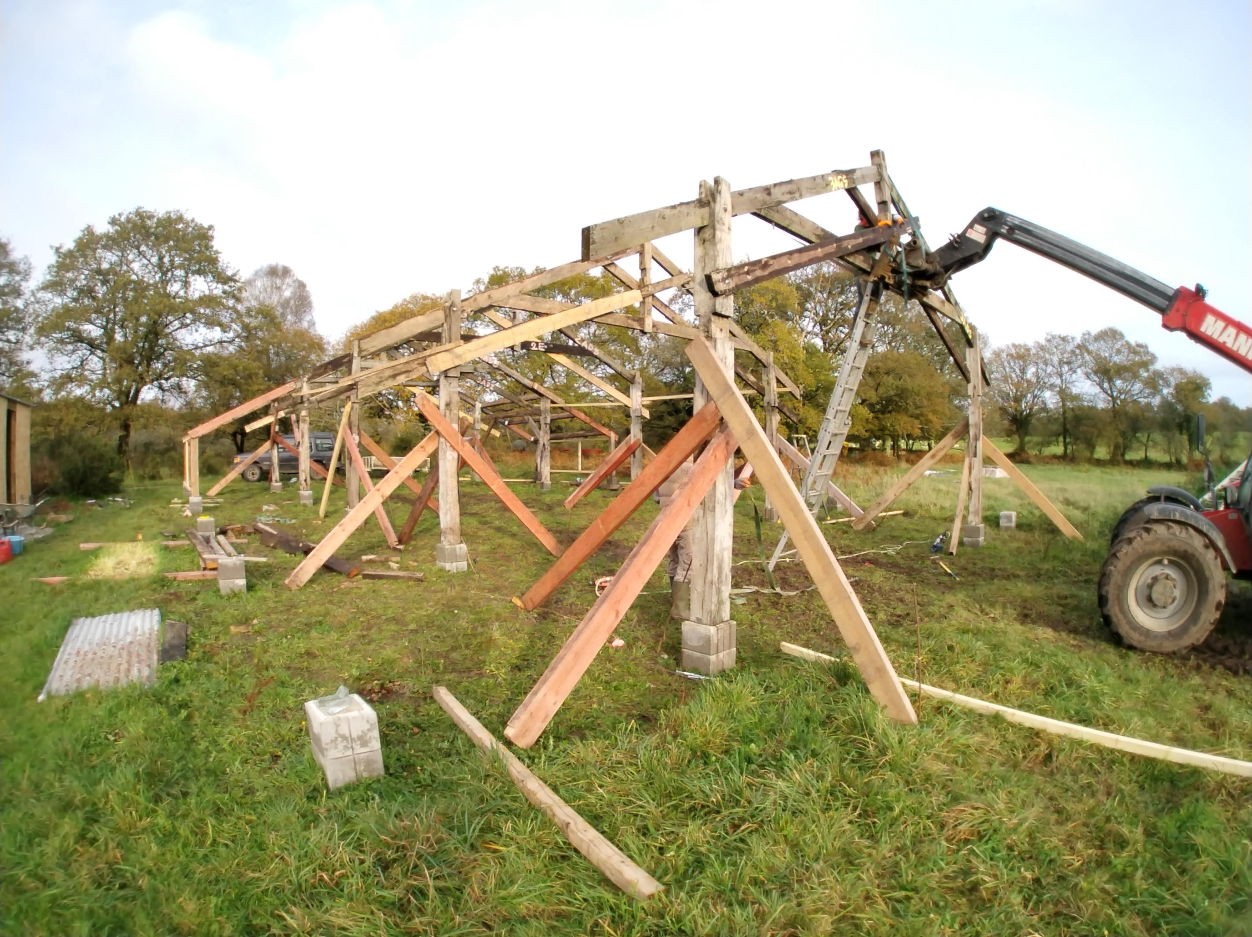 Remontée plus basse et plus petite à partir d’un hangar de 500m² destiné à la destruction en 2015, la bergerie fait 200m². Ce fut une sacrée aventure à remonter… Note pour plus tard: non, tous les poinçons ne sont pas « identiques » et les marquer comme le reste des poteaux, pannes, arbaletriers et autres entrais aurait été une bonne idée 😉