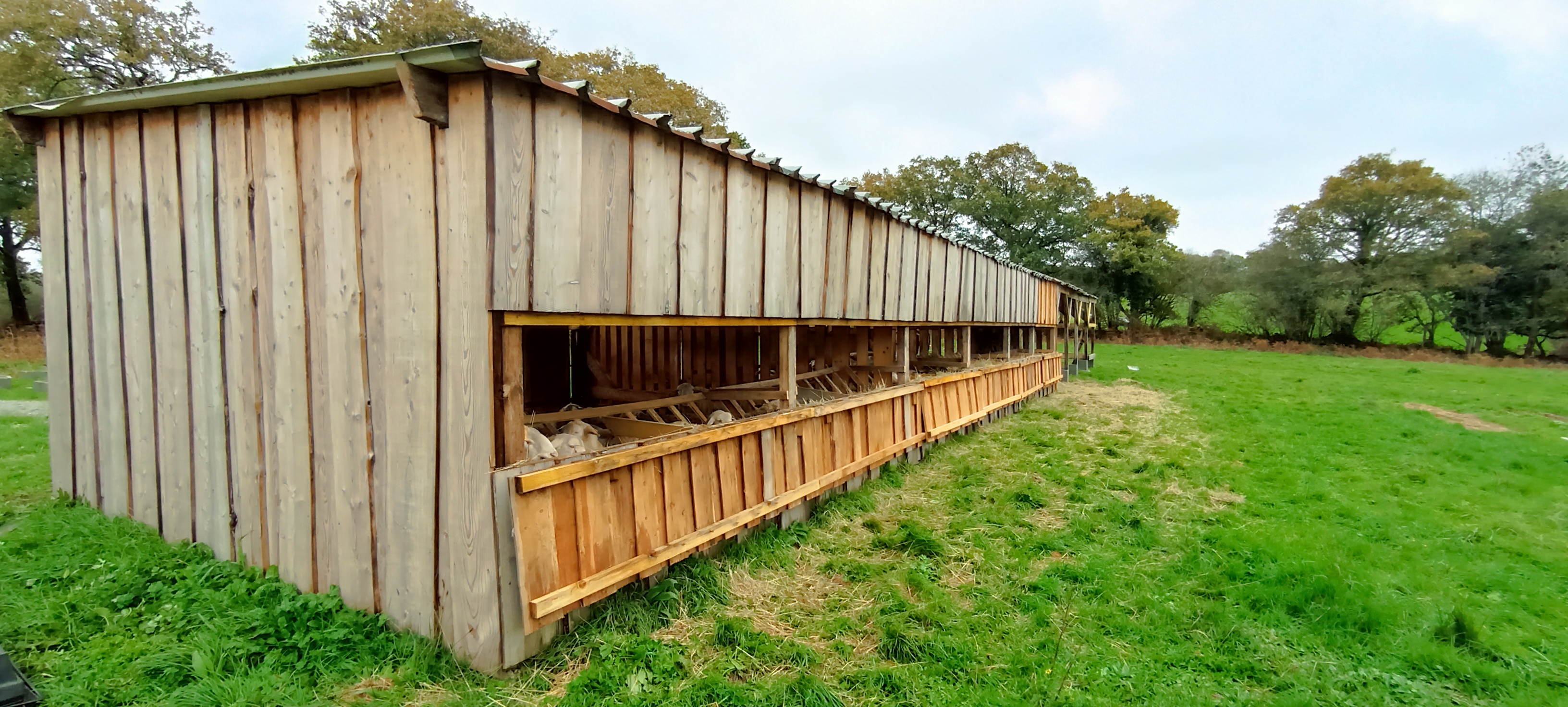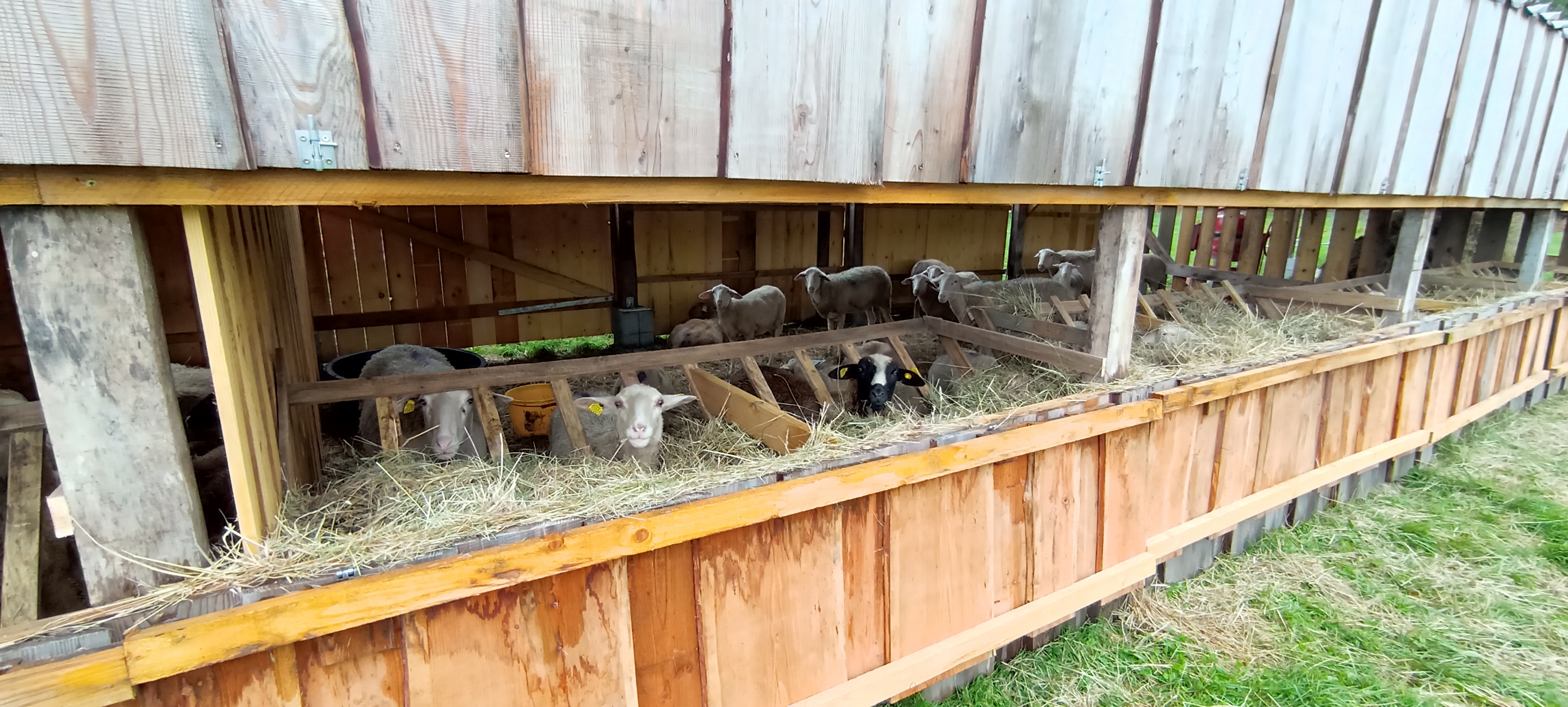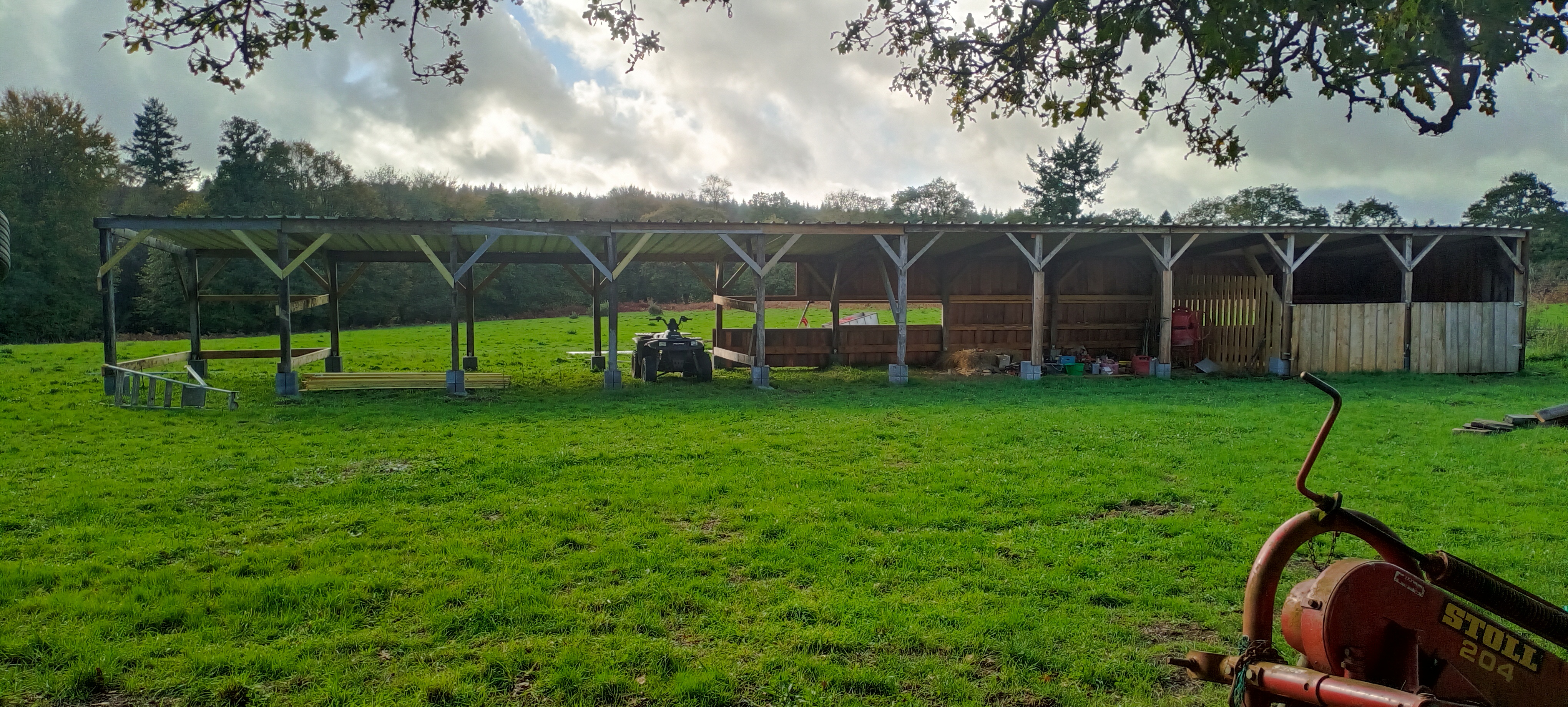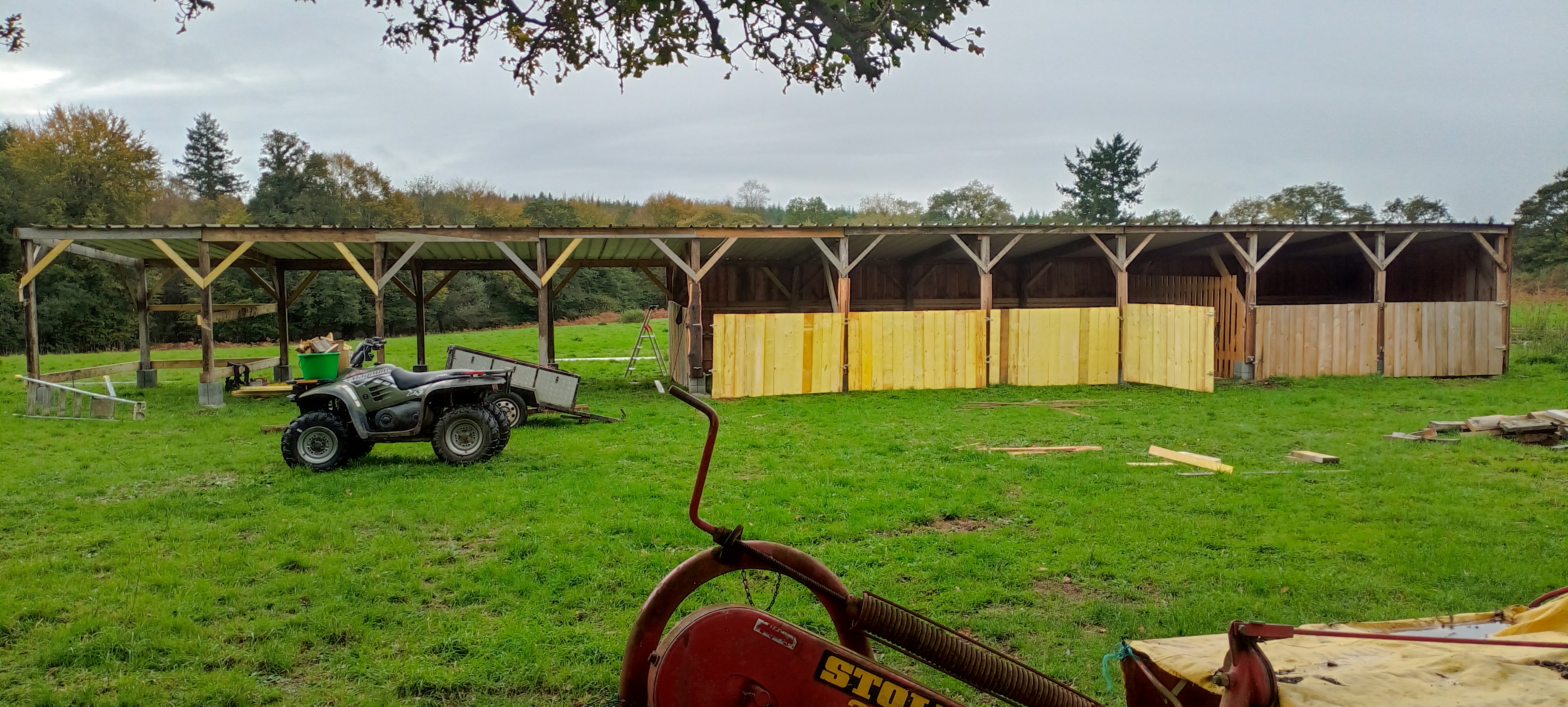 Pour les agnelles et les béliers une bergerie annexe 100% occasion, récupération mais aussi du bardage fait à partir de mélèzes abattus sur la ferme et débités chez un ami à quelques kilomètres.